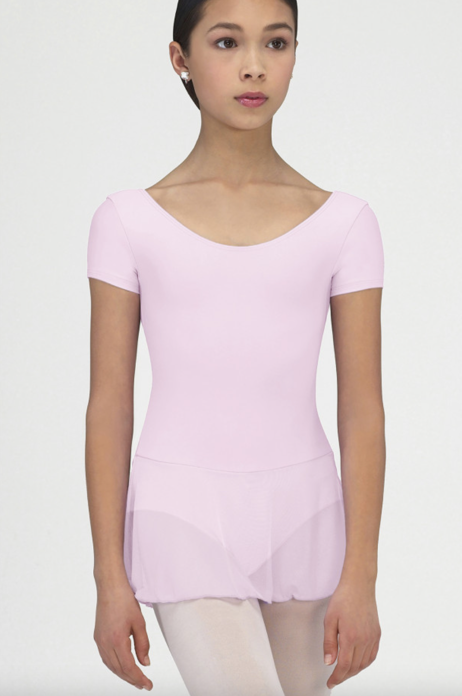 Short sleeve microfiber basic dress, featuring a modest, high back-cut and an attached four-way stretch tulle skirt. Available in 11 colors