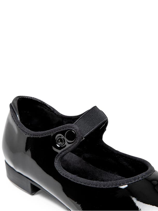 Meet our newest tap shoe for beginners! The Shuffle Tap comes in shiny black patent leather, caramel leather or white leather. Adorable ribbon tie and double snap, fastening elastic will ensure the most secure fit. Features signature, Capezio Tele-Tone® toe and heel taps mounted on fiberboard for flawless sound. Introductory tappers will take their first steps with confidence in the Shuffle Tap.
