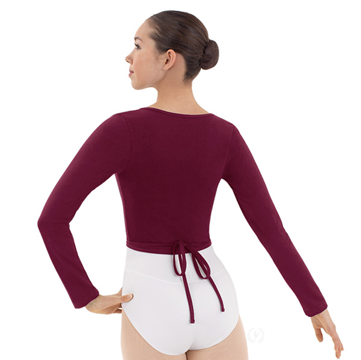 A super soft, Cotton Lycra® wrap sweater with matching ties for a stylish, secure, and customizable fit. The Cotton Lycra® fabric is comfortable and easy to move in, as well as durable and fade resistant for long-lasting wear. Wear this ballet sweater over a leotard to stay warm in a cold classroom, or to and from the studio as a fashionable dance cover-up!