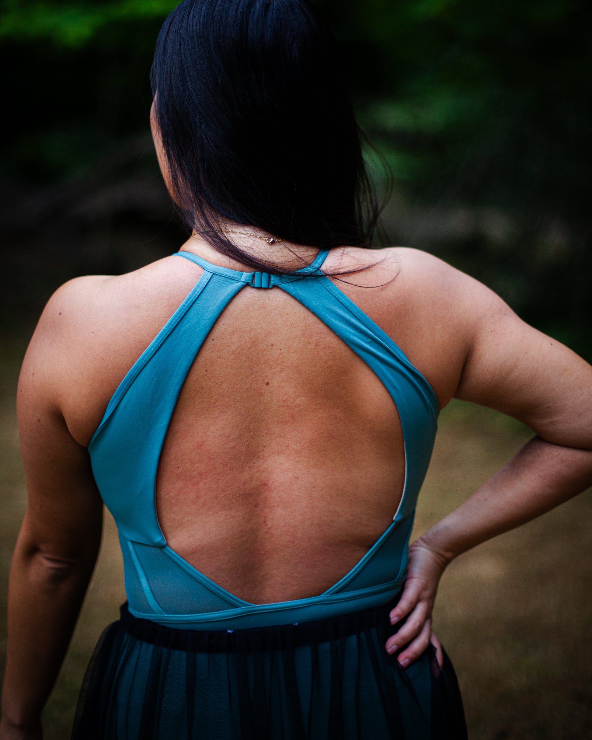 Our beautiful "Brigitte" halter style leotard offers a flattering neckline, sheer midriff with corset-style detailing and a tear drop back with a clasp closure behind the neck. This leotard is competition ready! Shelf bra with removable cups. Nylon/Spandex