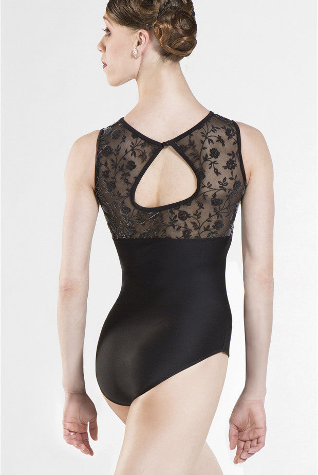 The faux sweetheart line of this soft and comfortable leotard is complimented with a one-button closure on the back of the neck, creating a key-hole look. Featuring 3-D flocked stretch tulle and soft microfiber. Full front lining.