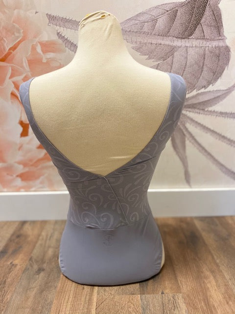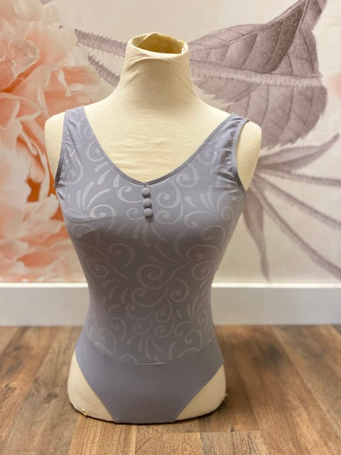 A flattering V-front tank style leotard, featuring a low open plunging V-style back. Embossed microfiber shows off the intriguing detail on the garment. Fully front lining.