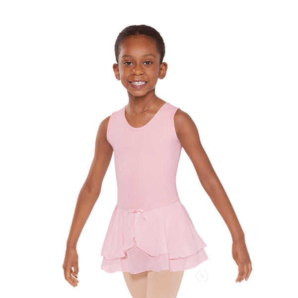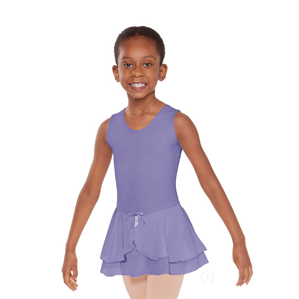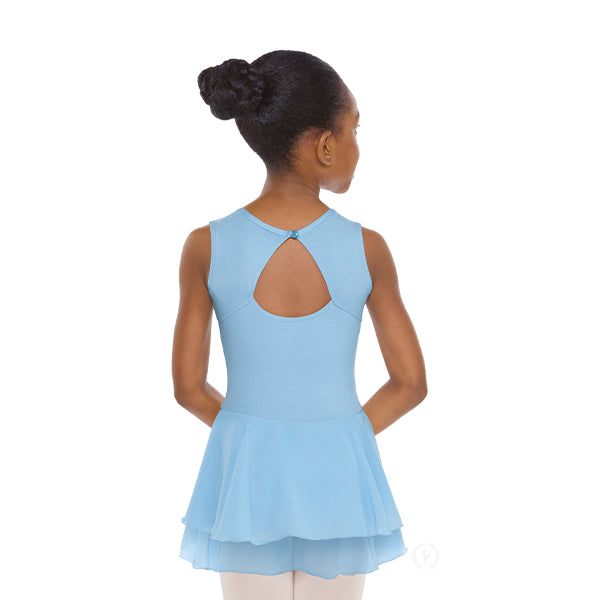 Cotton Lycra® dance dress with tank straps, scoop neck and removable satin and pearl pin. The color-matched button closure on the scoop back creates a unique triangle shaped keyhole. Attached, double layer chiffon skirt with mock wrap front and full front, antimicrobial leotard lining.