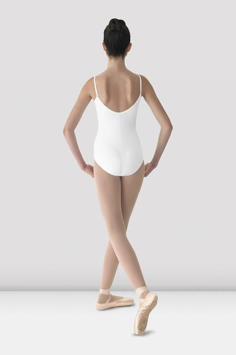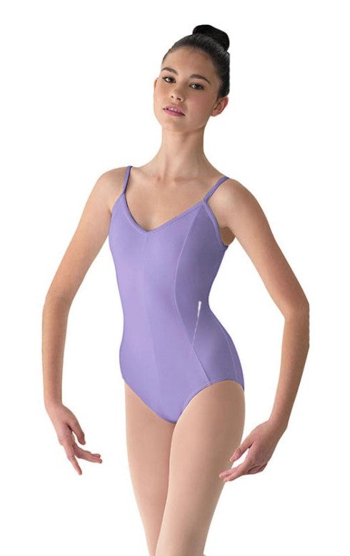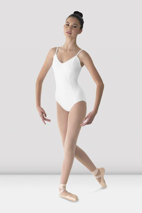 Classic camisole leotard with three princess seams features "V" front and low scoop back. Together with legendary Mirella fit and quality, this lovely shelf-lined camisole leotard has become popular with serious dancers throughout the world.