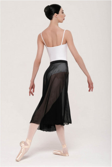 It is made from transparent stretch tulle and features an elastic waistband in solid-color microfiber. This generous skirt moves elegantly and smoothly for gorgeous lines.