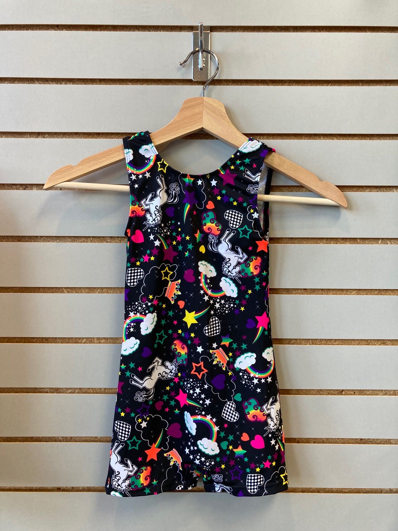 Unicorn biketard! Your budding champion will shine on the mat, the bars or the balance beam in this soft and stretchy biketard made in the USA. This biketard is 88% polyester and 12% spandex, machine wash lay flat to dry. This leotard will move with you and stay smooth and sleek. The fabrics are soft, stretchy and tagless for a scratch free fit.