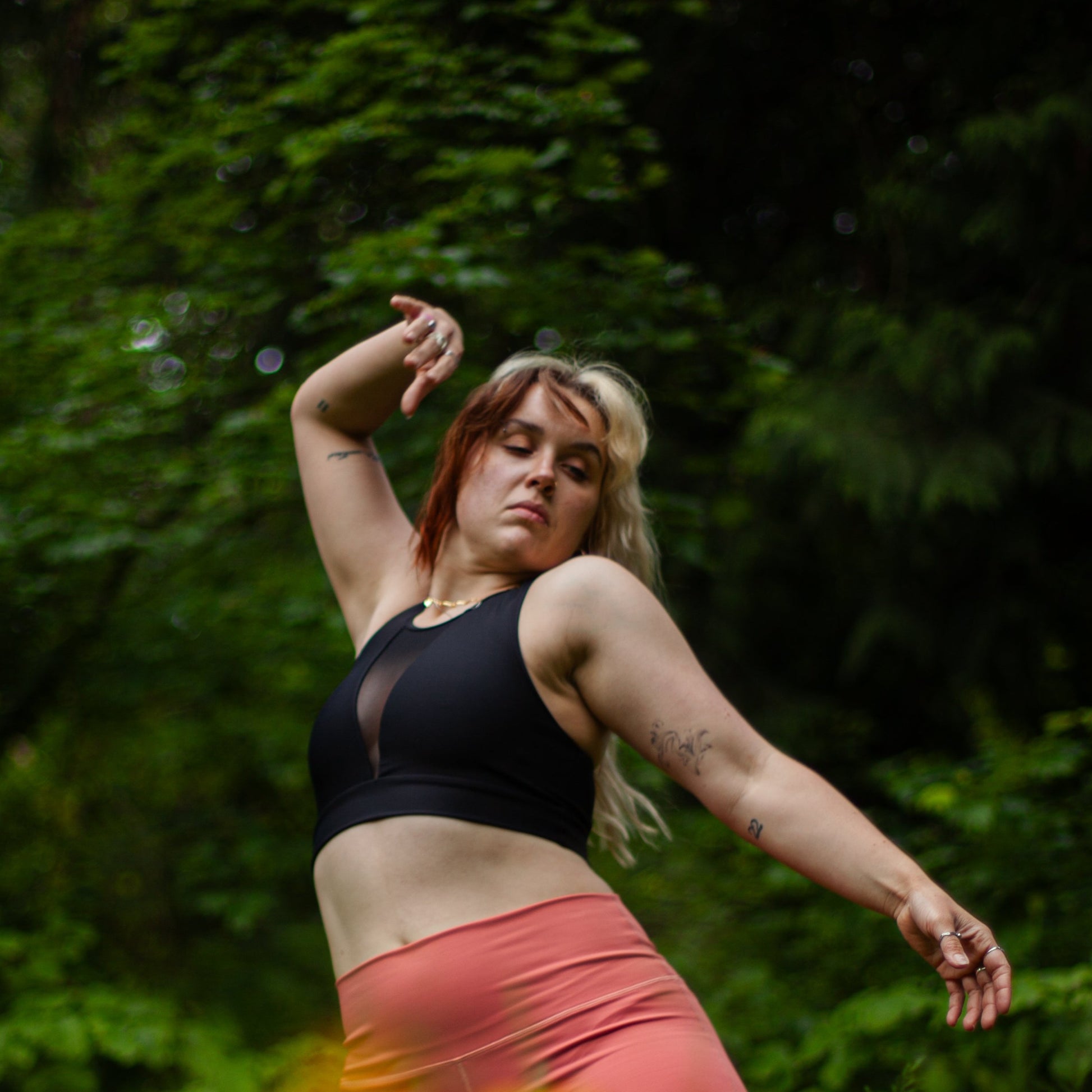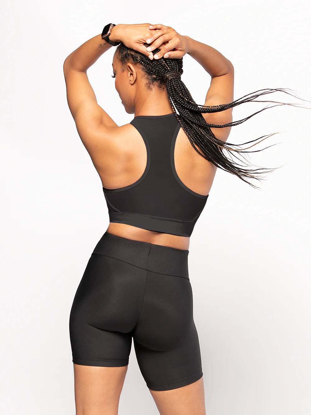 The Vivian Crop Top in Soft Black with Black Mesh Front V and racer back is a sultry staple piece for all of your active wear needs.